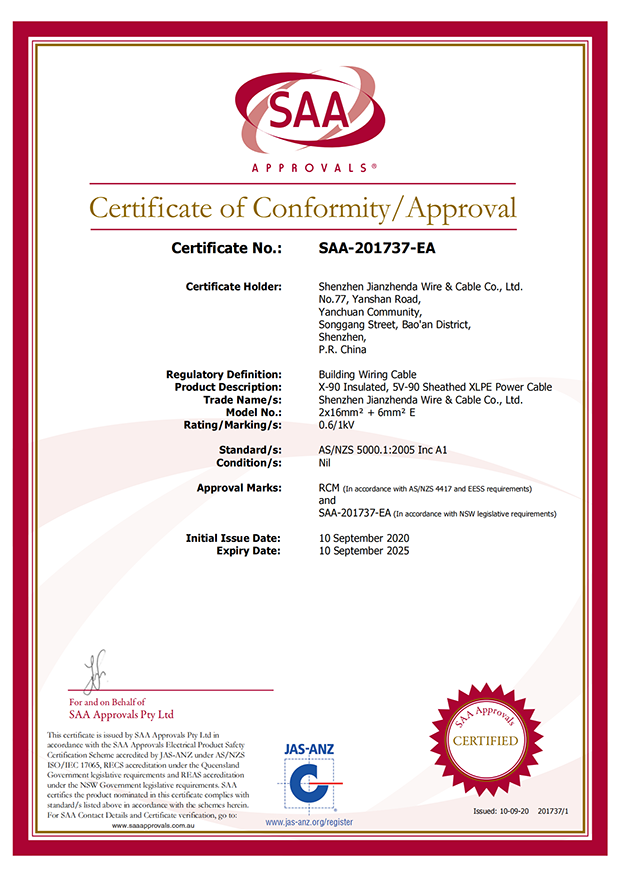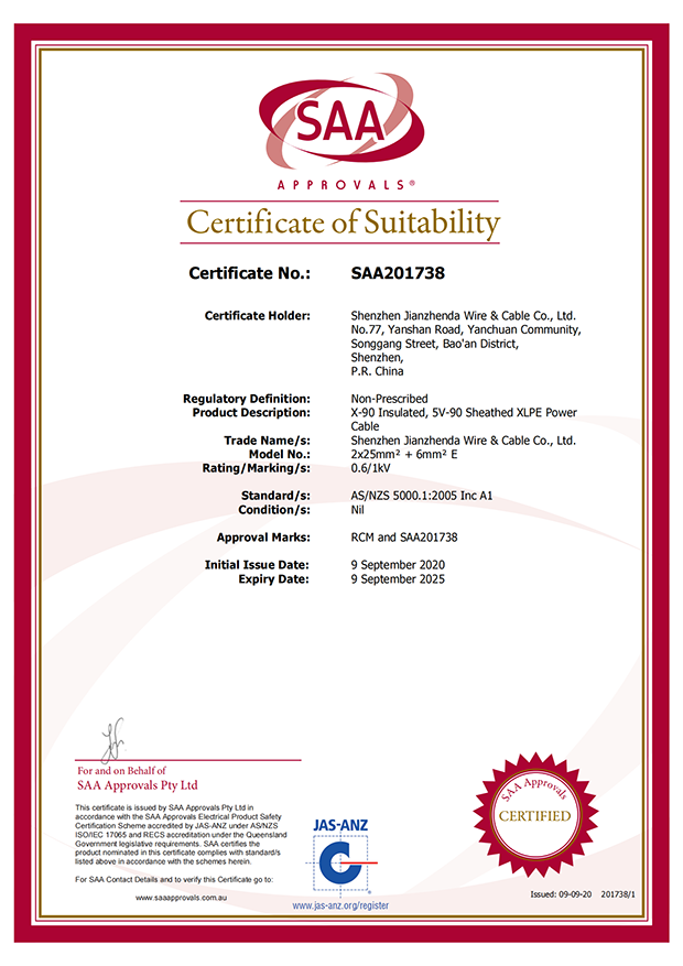 深圳建圳達(dá)電線電纜有限公司,成立于2000年,是一家電線電纜制造商,我們通過了世界各地不同市場(chǎng)的多數(shù)認(rèn)證,如:CCC、RoHS、CB、SAA、TUV、VDE、PSE、BPS、UL、CSA。我們根據(jù)定制產(chǎn)品不斷更新新的認(rèn)證。經(jīng)過數(shù)十年的發(fā)展,我們與來自世界各地的客戶建立了長(zhǎng)期的合作關(guān)系。我們?cè)?jīng)是菲律賓機(jī)場(chǎng),,柬埔寨的電力站,美國的醫(yī)院,工廠,埃塞俄比亞的水電站項(xiàng)目。我們是一家值得信賴的電線供應(yīng)商。